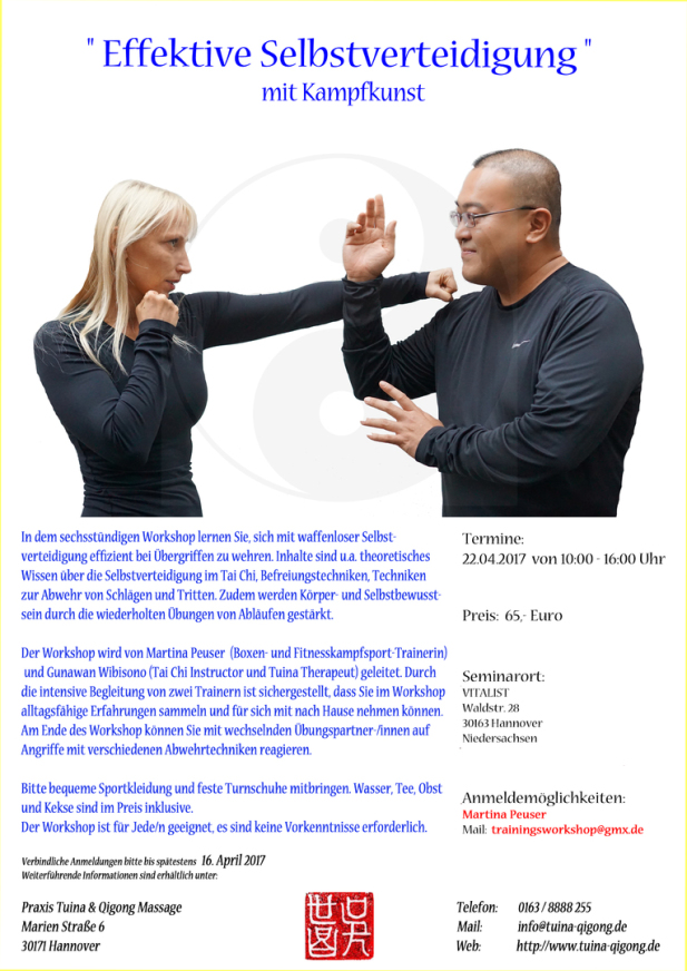 Der Workshop wird von Martina Peuser (Boxen- und Fitnesskampfsport- Trainerin) und Gunawan Wibisono (Tai Chi Instructor und Tuina Therapeut) geleitet. Durch die intensive Begleitung von zwei Trainern ist sichergestellt, dass SIe im Workshop alltagsfähige Erfahrungen sammeln und für sich mit nach Hause nehmen können. Am Ende des Workshop können Sie mit wechselnden Übungspartner-/innen auf Angriffe mit verschiedenen Abwehrtechniken reagieren.