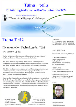 Verbindliche Anmeldung für Tuina Teil 1 + 2 Seminarwochenenden bitte bis spätestens 17. Juni 2013